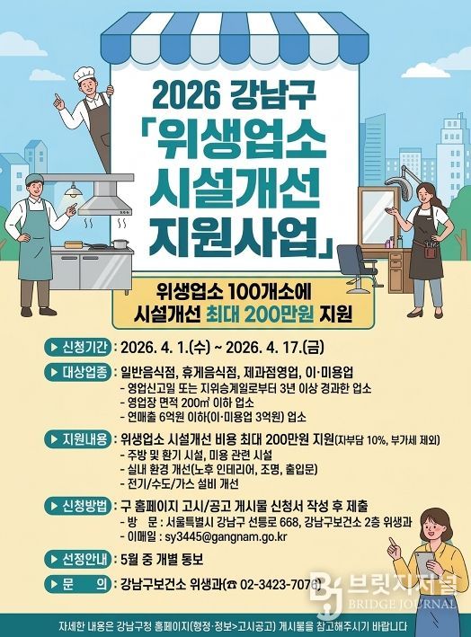 브릿지저널 김경미 기자 | 꿈이 모이는 도시, 미래를 그리는 강남구가 경기침체와 매출 감소로 어려움을 겪는 위생업소의 영업환경 개선을 위해 ‘위생업소 시설개선 지원사업’을 추진한다. 강남구 내 일반음식점, 휴게음식점, 제과점영업, 이·미용업소 등 100개소를 대상으로 업소당 최대 200만 원의 시설개선 비용을 지원한다.