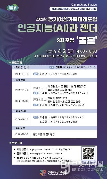 브릿지저널 김경미 기자 | 경기도여성가족재단은 3일 재단 회의실에서 ‘인공지능과 돌봄’을 주제로 경기여성가족미래포럼을 개최한다. 3월부터 5월까지 총 5차례 진행하는 경기여성가족미래포럼 중 이번이 3회차다.