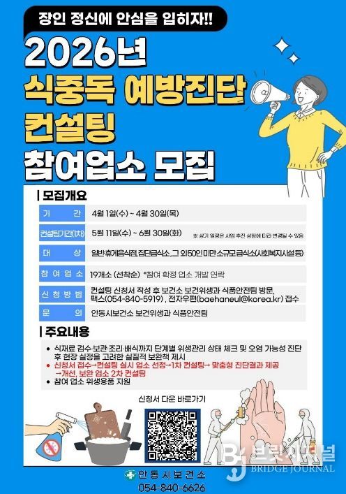 브릿지저널 정보영 기자 | 안동시는 식중독 발생 우려가 높은 업소를 대상으로 위생 수준 향상과 사전 예방을 위해‘2026년 식중독 예방진단 컨설팅’ 참여업소를 모집한다고 밝혔다.