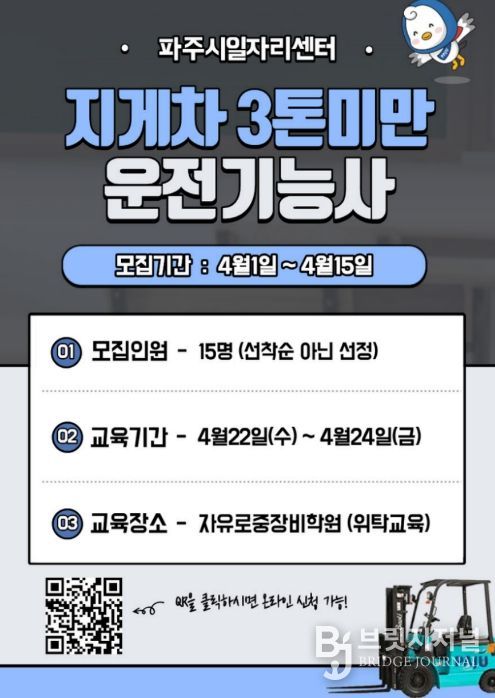 브릿지저널 김경미 기자 | 파주시는 4월 1일부터 4월 15일까지 관내에 거주하는 중장년층 구직자를 대상으로 ‘지게차(3톤 미만) 운전기능사’취업지원 프로그램 참여자 15명을 모집한다고 밝혔다.