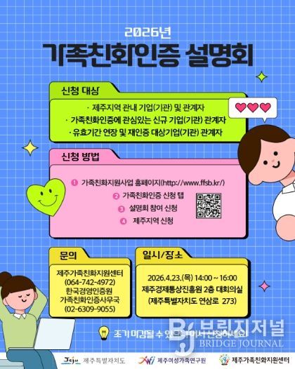 브릿지저널 정보영 기자 | 제주특별자치도와 제주여성가족연구원 제주가족친화지원센터는 2026년 가족친화인증 신규 및 재인증 신청 접수에 따라 도내 기업(관)을 대상으로 가족친화인증 설명회를 개최한다.
