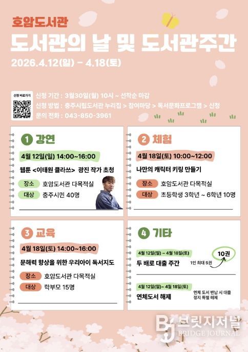 브릿지저널 김경미 기자 | 충주시 호암도서관은 제4회 ‘도서관의 날’과 제62회 ‘도서관주간’을 맞아 4월 12일부터 18일까지 7일간 다채로운 독서문화 행사를 운영한다고 2일 밝혔다.