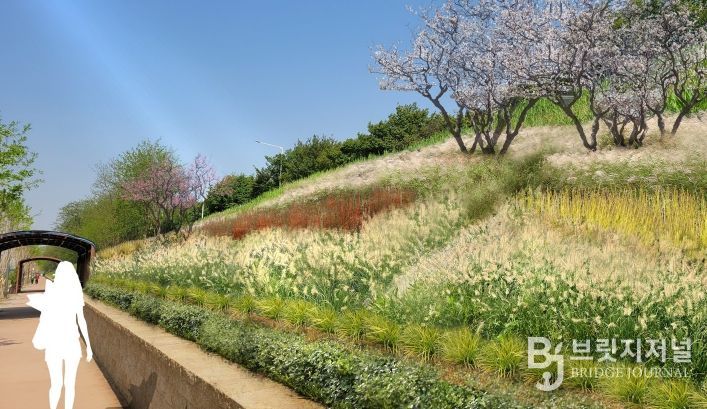 ▲제방은 은빛 물결은 담은 제방숲으로 탄생한다. 제방사면은 호안의 기능을 유지한 채 코코넛 섬유를 활용한 자연 친화적인 식재 기반을 만들고, 물억새·수크령 등이 어우러져 신비로운 분위기를 연출한다. 또, 탄천1교~탄천2교 진출입로에는 다양한 수종의 꽃을 심어 야생화 정원을 조성할 계획이다.