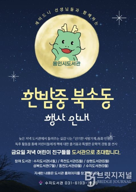 브릿지저널 김경미 기자 | 용인특례시 서부도서관은 수지‧죽전‧상현‧성복‧동천도서관에서 야간 독서문화 프로그램 ‘한밤중 북소동’을 운영한다고 25일 밝혔다.