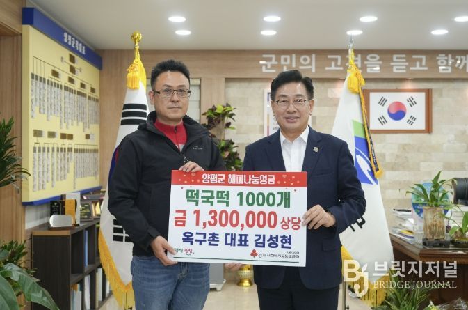 브릿지저널 김경미 기자 | 양평군은 지난 1일 농업회사법인 ㈜옥구촌한우가 지역 내 취약계층을 위해 130만 원 상당의 떡국떡 1,000개를 기탁했다고 밝혔다.