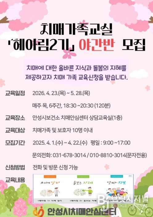 브릿지저널 김경미 기자 | 안성시보건소 치매안심센터가 직장이나 생업으로 낮시간대 교육받기 어려운 치매환자 가족을 위하여 오는 23일부터 가족교실 야간반을 운영한다.