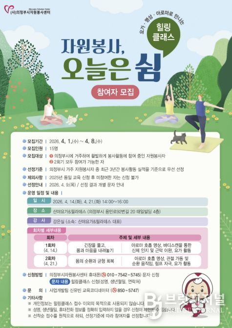 브릿지저널 김경미 기자 | 의정부시자원봉사센터는 4월 1일부터 4월 8일까지 자원봉사자들의 지속 가능한 자원봉사 활동 활성화를 위해 지친 몸과 마음을 회복하는 요가·명상·아로마로 만나는 힐링 클래스'자원봉사, 오늘은 쉼'참여자를 모집한다.