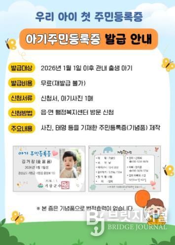 브릿지저널 김경미 기자 | 거창군은 소중한 아기의 출생을 기념하고 출산 장려를 위한 사회적 분위기를 조성하기 위해, 지난 2025년부터 시행 중인 ‘아기 주민등록증’ 무료 발급 서비스를 올해도 지속 추진하고 있다.