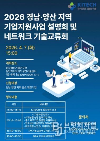 브릿지저널 김경미 기자 | 양산시는 오는 7일 한국생산기술연구원 첨단하이브리드생산기술센터 세미나실에서 지역 산업 발전 촉진과 관내 제조기업의 기술 혁신을 도모하기 위해 ‘2026년 기업지원사업 설명회 및 네트워크 기술교류회’를 개최한다고 밝혔다.