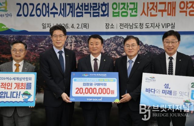 브릿지저널 김경미 기자 | (재)2026여수세계섬박람회조직위원회는 4월 2일 전남도청 VIP실에서 탑솔라㈜와 ‘2026여수세계섬박람회 입장권 구매약정식’을 개최했다고 밝혔다.