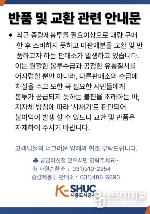 브릿지저널 김경미 기자 | 시흥시는 종량제봉투 공급이 안정화되면서 관내 일부 판매소를 중심으로 재고 조정을 위한 반품 요청이 증가하고 있다고 3일 밝혔다.