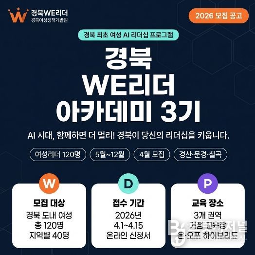 브릿지저널 정보영 기자 | 경상북도와 경북여성정책개발원은 지역사회와 함께 성장하고 싶은 여성리더를 대상으로‘경북 WE리더 아카데미 3기’참가자를 4월 1일부터 4월 15일까지 모집한다.