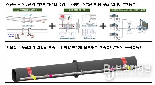 새로운 관로를 매설하면서 신축관을 활용해 센서를 부착하는 ‘상수관의 위치변위정보 수집이 가능한 신축관 이음 구조’와 기존 매설돼 있는 관로 중 일부 침하가 예측되는 구간만 집중 관리할 수 있도록 고안한 ‘주철관의 변형을 계측하기 위한 부착형 벨로우즈 계측장치’ 2가지이다.