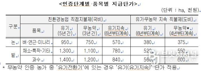 무농약은 3년(3회), 유기는 5년(5회) 인증단계별·품목별 지급단가는 ha당 유기농은 95만원~140만원, 무농약은 75~120만원으로 지급된다. 또한 저농약 지급 이력은 제외하여 친환경 인증 농가의 직불금 수혜 기회를 확대했다.