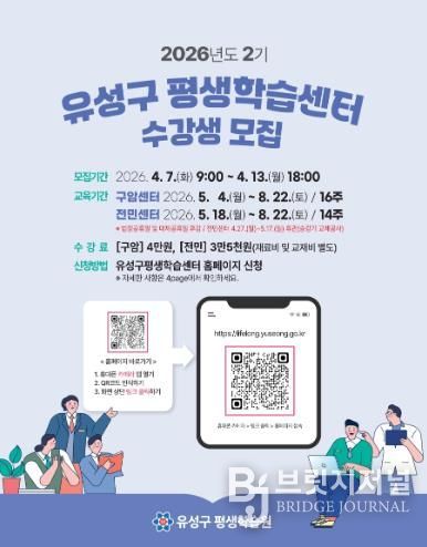 브릿지저널 정보영 기자 | 대전 유성구는 오는 7일부터 13일까지 구암평생학습센터와 전민평생학습센터에서 ‘2026년 2기 평생학습센터’ 수강생을 모집한다.