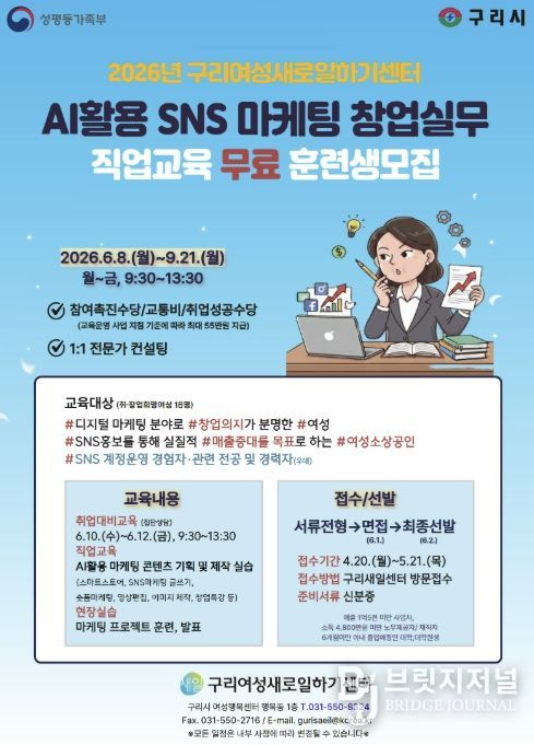 브릿지저널 김경미 기자 | 구리시는 구리새일센터에서 여성들의 디지털 마케팅 역량을 강화하고 성공적인 취·창업을 지원하기 위해 ‘AI 활용 SNS 마케팅 창업 실무’ 직업교육훈련 과정의 교육생을 오는 4월 20일부터 모집한다고 밝혔다.