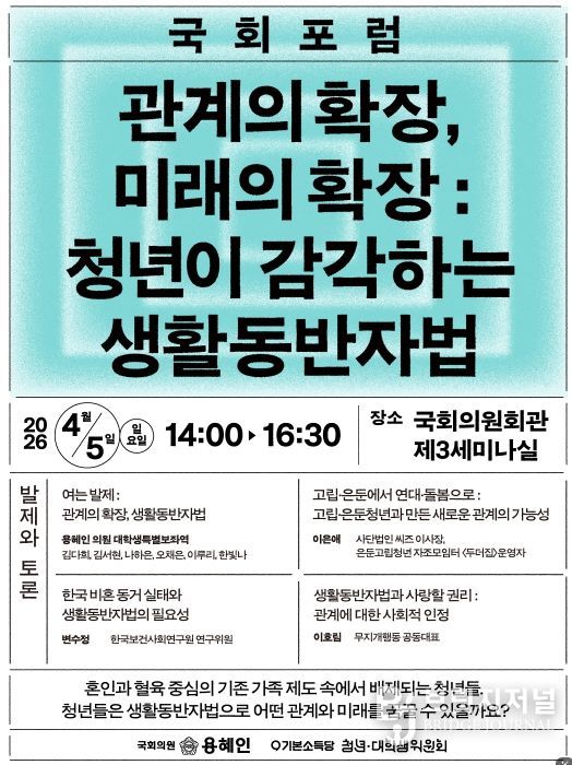 브릿지저널 김경미 기자 | 6 3 지방선거를 앞두고 다양한 청년정책이 발표되는 가운데, 청년 당사자가 직접 청년정책으로서 생활동반자법의 의미와 필요성을 조망하는 국회포럼이 개최된다. 이날 포럼에는 50여 명의 청년 당사자가 참석해 생활동반자법에 대한 의견을 나눌 예정이다.