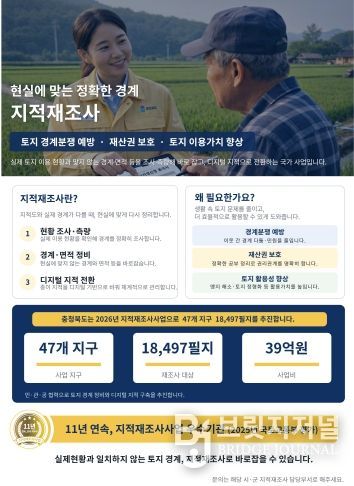 김승래 도 토지정보과장은 “지적재조사사업은 도민의 재산권 보호와 생활 불편 해소에 직결되는 중요한 사업”이라며 “이번 지구 지정을 시작으로 경계 불일치 해소에 속도를 내고 도민들이 사업 내용을 더 쉽게 이해할 수 있도록 현장 중심의 홍보와 안내를 강화 하겠다”고 말했다.