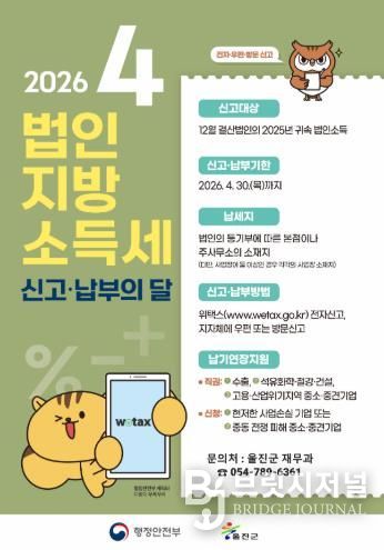 브릿지저널 정보영 기자 | 울진군은 4월 한 달간 법인지방소득세 집중신고·납부기간을 운영한다.