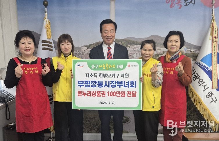 브릿지저널 윤나영 기자 | 부산 중구 부평깡통시장부녀회(회장 최남숙)에서 지난 6일 중구청을 방문하여 저소득 한부모가구 지원을 위해 회원들이 정성껏 모은 이웃돕기성품(온누리상품권 100만원)을 전달했다.