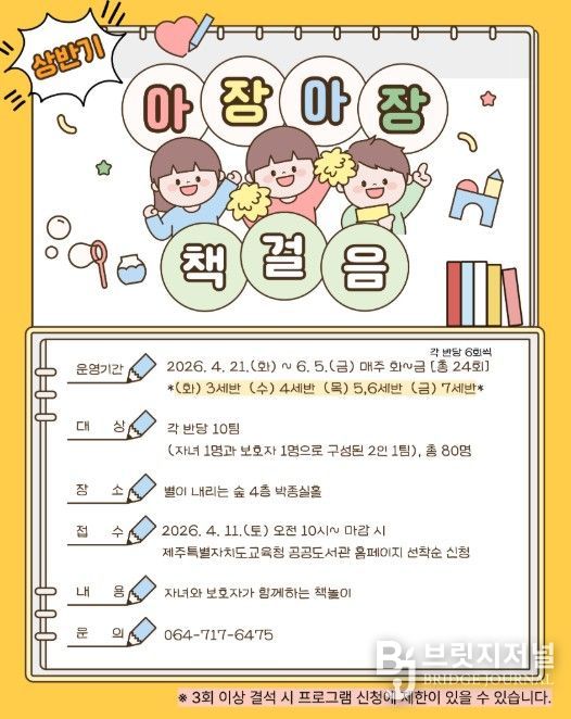 브릿지저널 정보영 기자 | 제주도교육청 제주도서관은 21일부터 6월 5일까지 영유아의 언어 발달과 올바른 독서 습관 형성을 지원하고 가정 중심의 독서 문화를 확산하기 위해 2026년 상반기 프로그램 ‘아장아장 책걸음’을 운영한다.