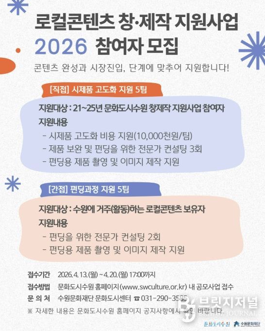 브릿지저널 김경미 기자 | 수원문화재단은 오는 20일까지 지역 고유의 문화자원을 활용한 로컬콘텐츠 발굴과 창작자 육성을 위해 ‘2026 로컬콘텐츠 창·제작 지원사업’을 함께할 참여자를 모집한다.