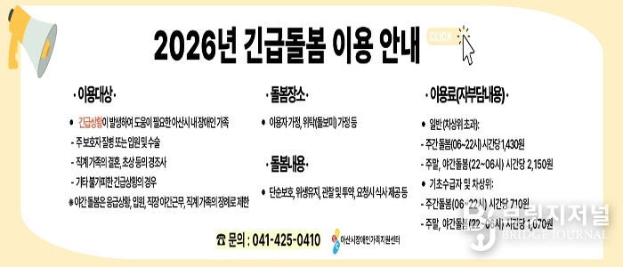 브릿지저널 정보영 기자 | 아산시는 장애인 가족의 돌봄 부담을 경감하고 삶의 질을 향상하기 위해 ‘중증장애인 긴급돌봄서비스’를 추진한다.