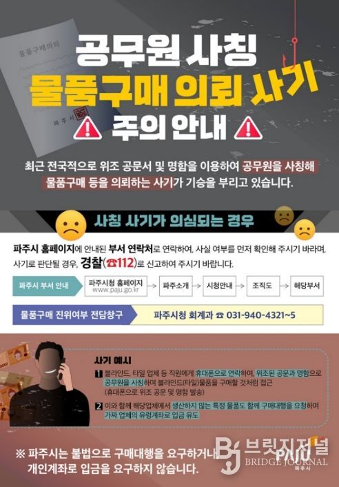 브릿지저널 김경미 기자 | 파주시는 최근 전국적으로 확산 중인 공무원 사칭 사기 전화(보이스 피싱) 및 공문서 위조를 동반한 물품구매 사기 시도가 지속적으로 발생함에 따라, 관내 납품업체와 시민 피해 예방을 위해 각별한 주의를 당부했다.