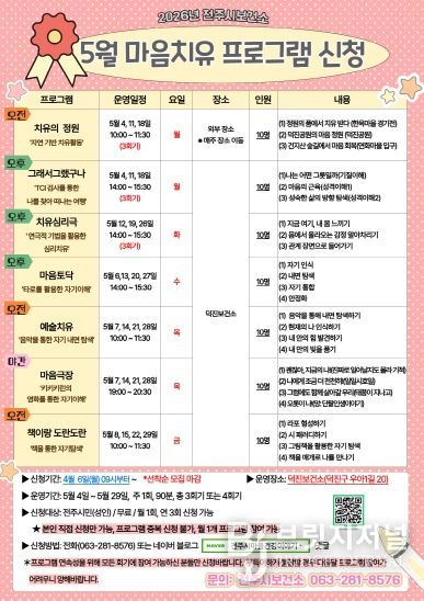 현재 오는 5월 운영될 마음치유 프로그램에 참여할 시민들의 참여 신청을 선착순 모집 중으로, 참여를 원하는 시민은 전주시 마음건강이야기 블로그 또는 전화로 문의하면 된다.