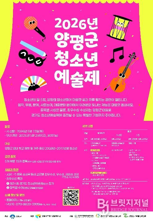 브릿지저널 김경미 기자 | 양평군이 주최하고 양평서부청소년문화의집이 주관하는 ‘2026년 양평군 청소년예술제’가 오는 5월 개최되며, 4월 7일부터 25일까지 예술제 참가자를 모집한다.