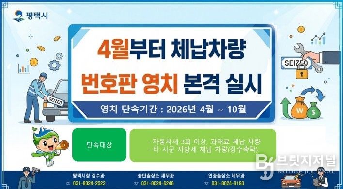 브릿지저널 김경미 기자 | 평택시는 자동차세 및 차량 관련 과태료를 상습적으로 미납한 체납 차량을 대상으로 오는 4월부터 번호판 영치 단속을 본격 실시한다고 밝혔다.