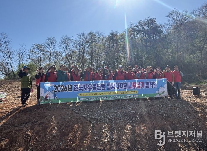 브릿지저널 김경미 기자 | 한국자유총연맹 밀양시지회(회장 최금식) 8일 무안면 운정리 산2번지 일대에서 산불 예방 및 탄소중립 실현을 위한 나무심기 행사를 개최했다.