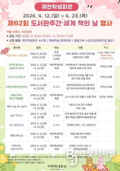 브릿지저널 김경미 기자 | 제천학생회관은 제62회 도서관주간(4. 12.~4. 18.)을 맞아 ‘도서관 속 작은 펼침, 세상을 여는 큰 열림’을 주제로 시민과 학생이 함께 즐길 수 있는 다양한 독서문화 행사를 마련했다.