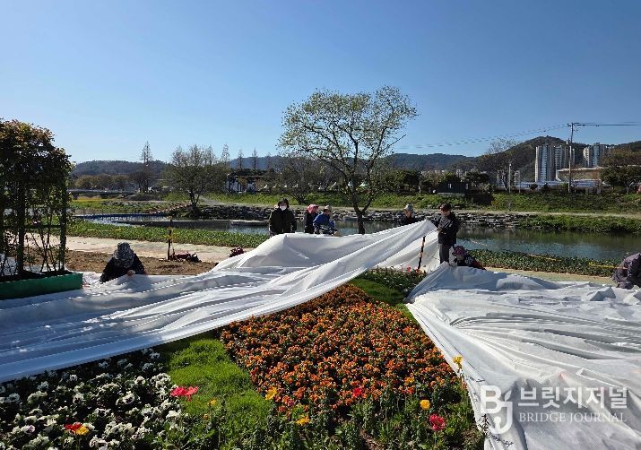 특히 꽃강길 일원에 식재된 초화류는 저온과 외부 환경 변화에 매우 민감해 일시적인 기온 저하에도 생육 저하나 꽃잎 손상으로 이어질 수 있어, 군은 서리 피해가 우려되는 주요 구간을 중심으로 부직포를 활용한 보온·보호 조치를 신속히 시행했다.