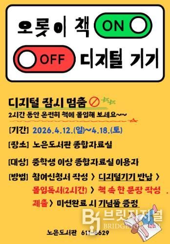 브릿지저널 정보영 기자 | 대전 유성구는 오는 12일부터 18일까지 도서관 주간을 맞아 노은도서관에서 ‘마음쓰임 프로젝트2:오롯이 책 ON, 디지털 OFF’ 독서 프로그램을 운영한다.