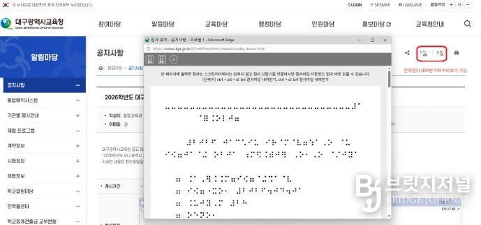 브릿지저널 김진석 기자 | 대구시교육청은 4월부터 시각장애인과 저시력자 등 정보 취약계층의 정보 접근성을 높이기 위해 시교육청 대표 누리집에 ‘전자 점자 서비스’를 도입해 운영한다.