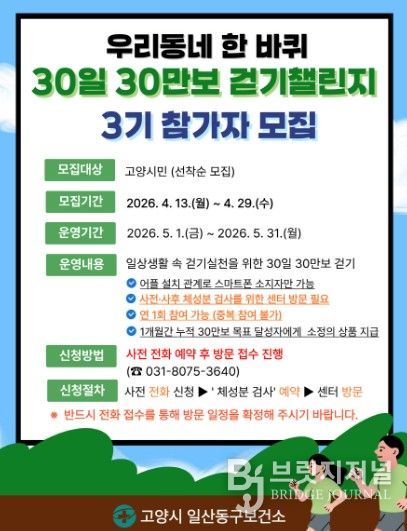 브릿지저널 김경미 기자 | 고양특례시 일산동구보건소는‘우리동네 한 바퀴 30일 30만보 걷기 챌린지’ 3기 참가자를 오는 13일부터 모집한다. 해당 프로그램은 지역 주민의 기초 체력 증진과 일상 속 신체활동 활성화를 위해 진행한다.