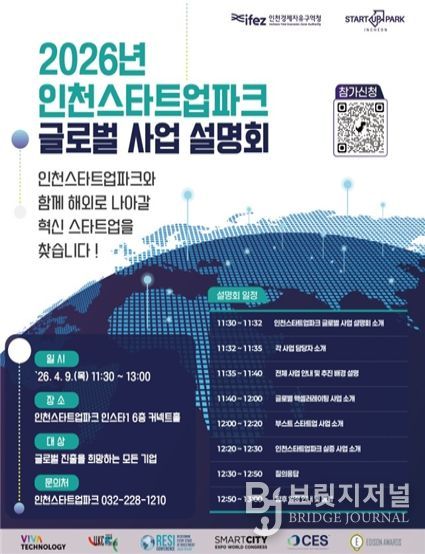 브릿지저널 김경미 기자 | 인천경제자유구역청(IFEZ)과 인천테크노파크(ITP)는 4월 9일 인천스타트업파크에서 ‘2026 인천스타트업파크 글로벌 사업 설명회’를 성황리 개최했다고 밝혔다.