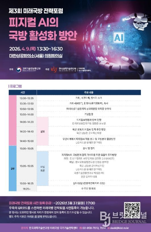 브릿지저널 김경미 기자 | 과학기술정보통신부는 한국과학기술연구원(원장 오상록)과 함께 4월 9일 대한상공회의소에서 제3회 미래 국방 전략 토론회(전략 포럼)(‘물리적 인공지능'피지컬AI'의 국방 활성화 방안’)을 개최했다고 밝혔다.