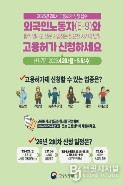 브릿지저널 정보영 기자 | 고용노동부는 4월 20일부터 5월 6일까지 전국 지방고용노동관서를 통해 2026년도 2회차 외국인노동자(E-9) 신규 고용허가 신청을 받는다고 밝혔다.