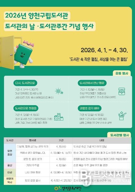 이번 행사는 ‘도서관 속 작은 펼침, 세상을 여는 큰 열림’을 주제로, 주민이 일상 속에서 자연스럽게 독서와 문화를 접할 수 있도록 기획됐다. 4월 한 달간 양천구 곳곳의 도서관에서는 다양한 이벤트와 도서관별 특색 있는 프로그램이 펼쳐질 예정이다.