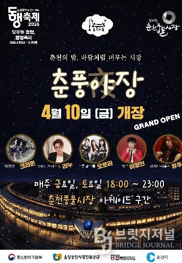 현준태 춘천시 부시장은 "지난해 큰 사랑을 받았던 춘풍야장이 올해는 더욱 풍성해진 콘텐츠와 쾌적한 환경으로 시민과 관광객을 맞이하게 됐다"며 "춘풍야장이 춘천의 밤을 대표하는 문화 관광 브랜드이자 지역 상권과 경제를 살리는 든든한 동력으로 확고히 자리매김할 수 있도록 적극 지원하겠다"고 밝혔다.