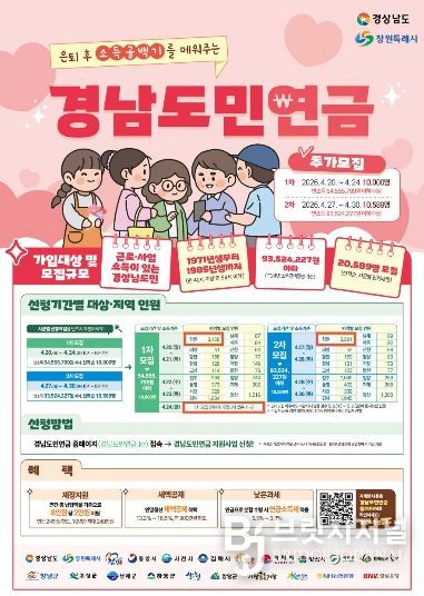 브릿지저널 김경미 기자 | 창원특례시는 은퇴 후 국민연금 수령 전까지 소득공백기 대비와 노후준비 지원을 위해 지난 1월 ‘경남도민연금’ 가입자 모집에 이어 4월 추가모집을 시행한다고 밝혔다.