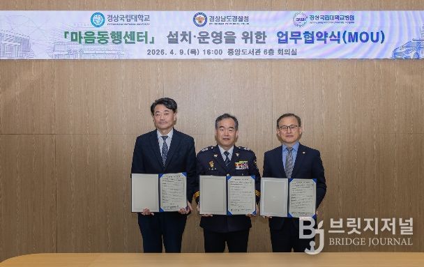 브릿지저널 김경미 기자 | 경상국립대학교, 경남경찰청, 경상국립대학교병원이 국가 치안을 책임지는 경찰관들의 정신 회복과 마음건강 증진을 위해 힘을 모으기로 했다. 세 기관은 4월 9일 오후 4시 경상국립대학교 가좌캠퍼스 중앙도서관 6층 회의실에서 ‘마음동행센터’ 신설 및 운영을 위한 업무협약을 체결했다.