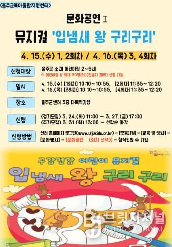 브릿지저널 윤나영 기자 | 울주군육아종합지원센터가 오는 15일과 16일 센터 3층 다목적강당에서 지역 어린이집 영유아 700명을 대상으로 어린이뮤지컬 ‘입냄새 왕 구리구리’를 개최한다고 10일 밝혔다.