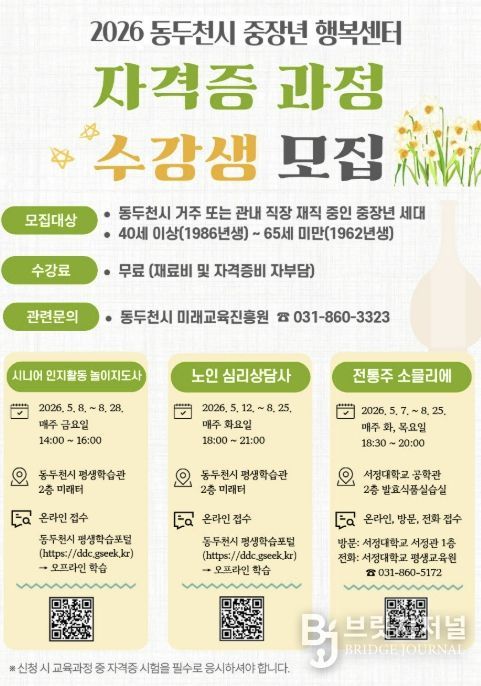 브릿지저널 김경미 기자 | 동두천시 미래교육진흥원은 지역 내 중장년층의 성공적인 인생 2막과 안정적인 사회 참여를 지원하기 위해 ‘2026년 중장년 행복센터 자격증 과정’ 수강생을 모집한다고 밝혔다.