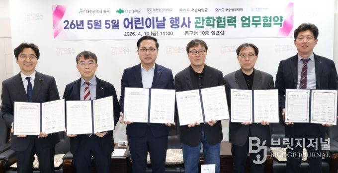 브릿지저널 정보영 기자 | 대전 동구와 10일 지역 내 5개 대학 RISE사업단과 오는 ‘제104회 어린이날 큰잔치’ 행사를 앞두고 지역 아동복지 증진과 체험 프로그램 강화를 위한 업무협약을 체결했다고 밝혔다.