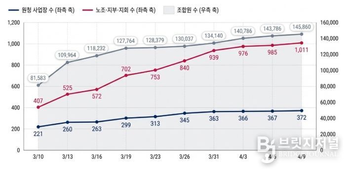 브릿지저널 정보영 기자 | 고용노동부는 개정 노동조합법 시행(’26.3.10.) 이후 1개월여 간 현장상황 파악 및 지도를 위해 원청 사업장에 대한 하청 노조의 교섭요구 현황 등을 확인·집계해 왔으며, 법 시행 1개월이 되는 4월 10일, 그간의 집계현황을 발표하면서 운영 상황도 함께 점검했다.