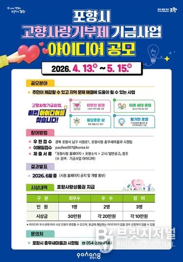 브릿지저널 정보영 기자 | 포항시가 기부자의 소중한 마음을 지역의 희망으로 전환하기 위해 ‘2026년 포항시 고향사랑기부제 기금사업 아이디어’를 공개 모집한다.