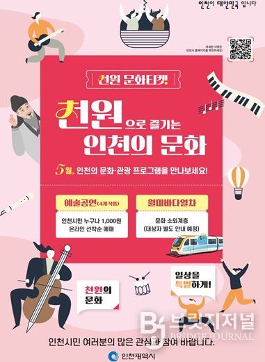 브릿지저널 김경미 기자 | 인천광역시는 시민 누구나 1,000원에 문화 프로그램을 즐길 수 있는 ‘천원 문화티켓’ 사업을 올해에도 시행한다고 밝혔다. 지난해 10월 최초 실시되어 많은 호응을 얻었던 천원 문화티켓 사업은 금년에는 상·하반기 두 차례에 걸쳐 운영되며, 상반기인 5월에는 공연 중심으로, 하반기인 10월에는 영화·스포츠까지 범위를 넓힐 예정이다.